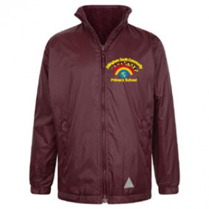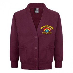 Embroidered, Billingham South, Maroon, Girls Sweat Cardigan with Two Pockets and Raglan Sleeves (from Zeco).
