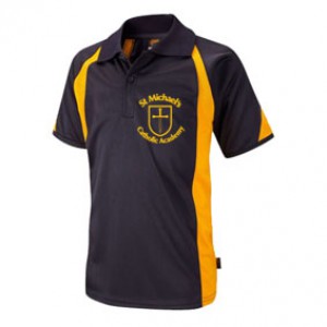 Embroidered, St Michaels RC, Navy Blue & Gold Sports Polo Shirt with Collar & Three Buttons (from Falcon Sportswear).
