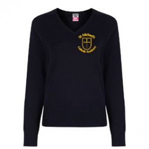 Embroidered, St Michaels RC, Girls, Navy Blue, V-Neck, Knitted, Light Weight, Cotton Pullover (from Rowlinson Knitwear).