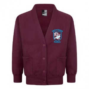 Embroidered, Crooksbarn Primary, Maroon, Girls Sweat Cardigan with Two Pockets and Raglan Sleeves (from Zeco).